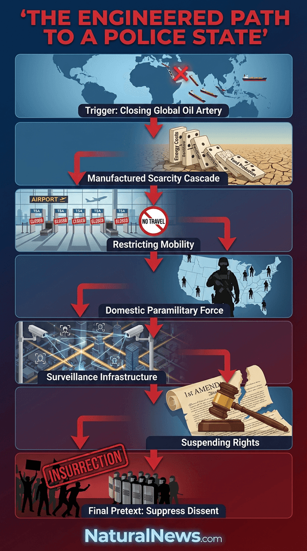 With scarcity engineered, the next phase is the restriction of mobility. The sudden, unexplained closures of Transportation Security Administration (TSA) security lanes at major airports are a trial run. This is not about security; it is a soft test of the public’s tolerance for travel restrictions. The logical escalation from closing airport security lanes is grounding civilian flights altogether, a measure economists now warn is a real possibility due to the Iran war [9]. The framework for locking down population movement is being assembled in plain sight.